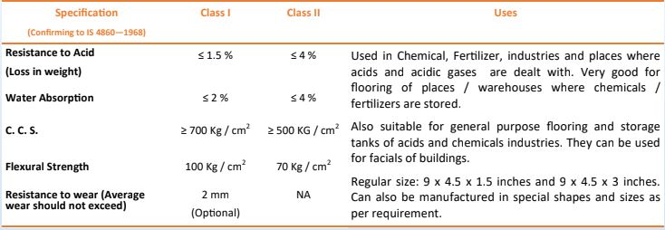 Acid Proof clay material be it bricks, tiles or special shapes we manufacture everything as per requirement of our clients. Bricks of 9×4.5×1.5 inches and 9×4.5×3 inches normally known as 38 mm and 75 mm respectively are most common in demand across industries. At times special shapes are required by industrial units which we manufacture and provide to their utmost satisfaction